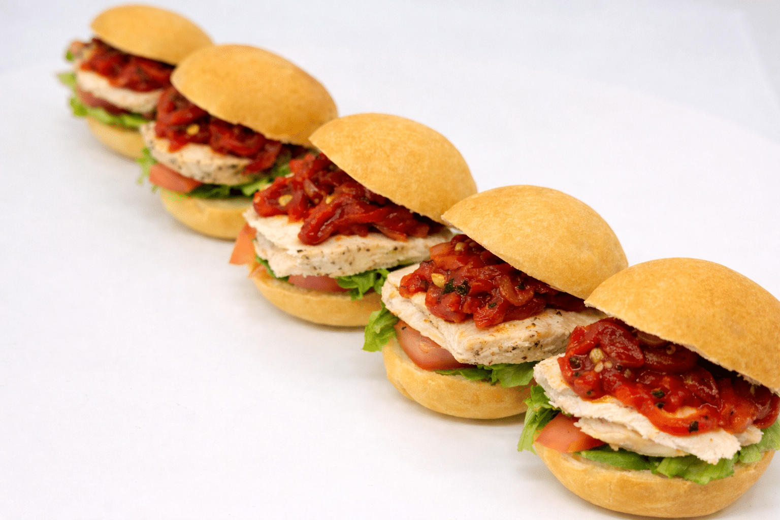 Mini challah rolls with marinated grilled chicken and roasted red pepper, garlic aioli, lettuce and tomato. Nut-free. Serves 10.