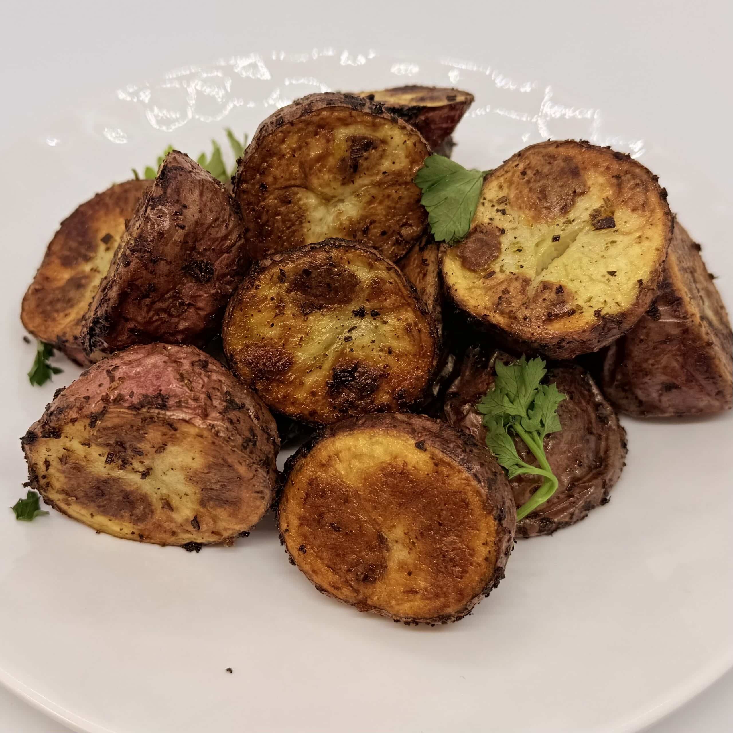 Crispy roasted baby potatoes tossed with olive oil, garlic, and fresh herbs. Vegan, Gluten-free, and Nut-free.
