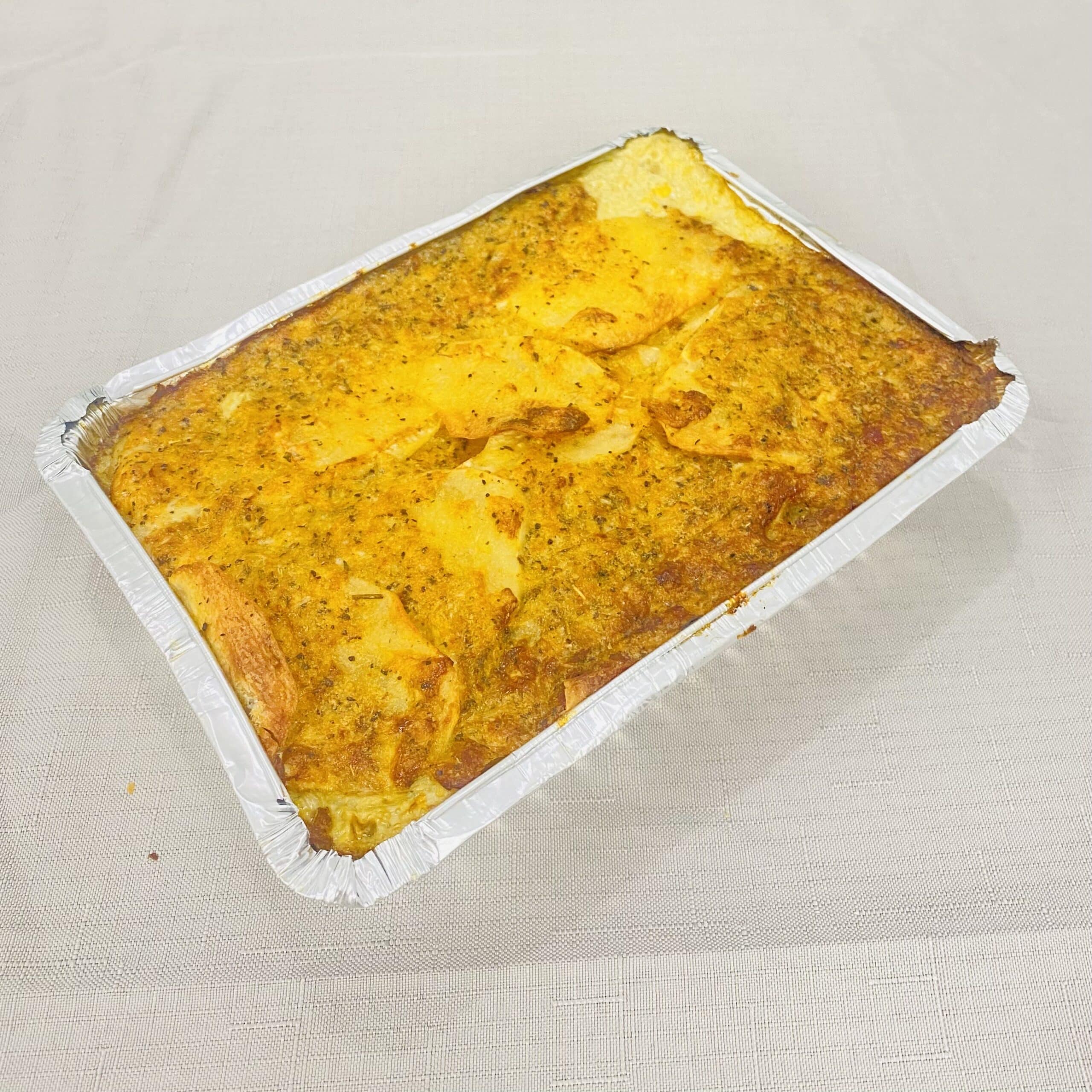 Thinly sliced Russet potatoes layered with onion, gently baked in a seasoned egg custard. Finished with a touch of margarine for a rich, golden top and comforting, savory flavor. Serves 4, nut-free, gluten-free, and vegetarian.