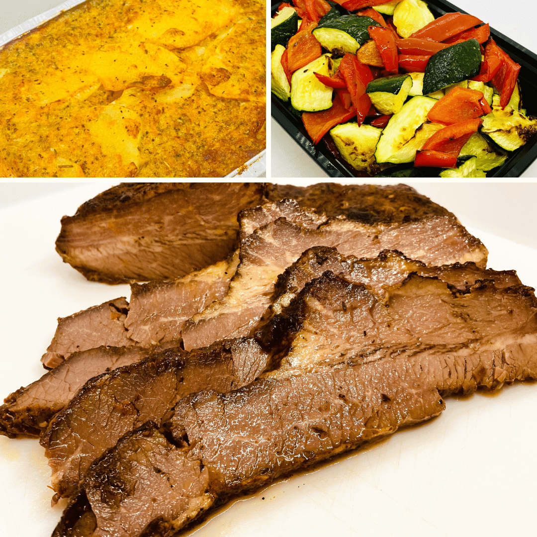 1 lb slow-braised brisket (GF, NF), scalloped potato kugel (NF, VG), roasted seasonal vegetables (GF, NF, V). Serves 4.
